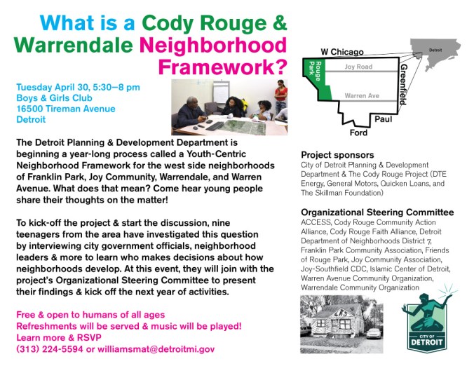 To mark the public kick-off of the year-long Cody Rouge & Warrendale Neighborhood Framework process, all area residents are invited to hear a presentation from nine area teenagers who have spent the last ten weeks interviewing city officials & neighborhoods leaders, attending public meetings, and trying to answer the question: What is a Cody Rouge & Warrendale Neighborhood Framework?