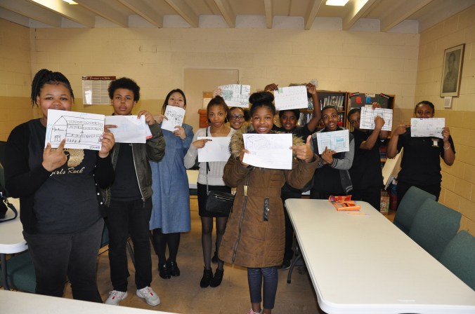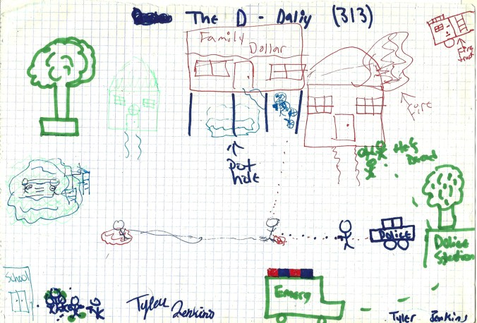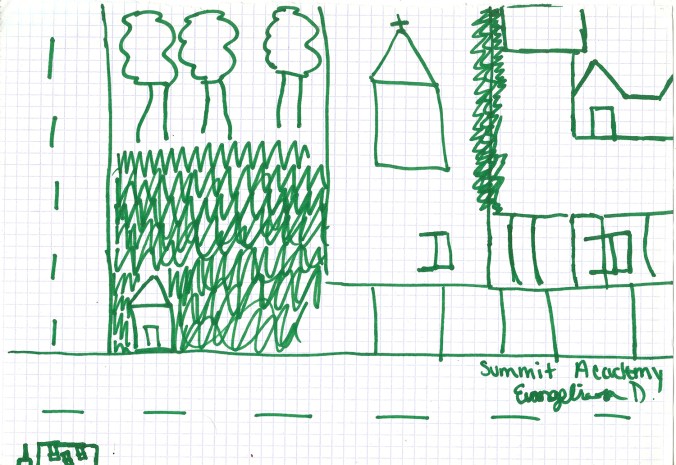 Faith Bevelle, Harmony Bevelle, Irving Bevelle, Paul Campbell, Evangelina Draper, Amiya Glover, Tyler Jenkins & Caleb Printup joined a 45-minute drawing exercise about the area around their church near West Chicago and Southfield Freeway.