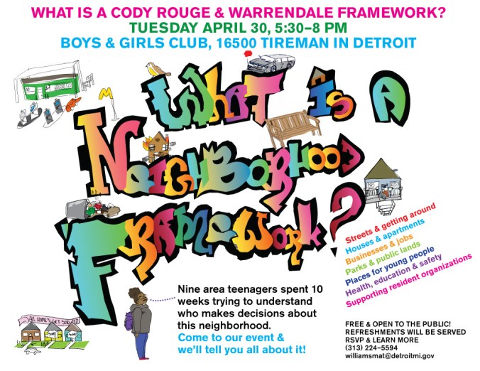 To mark the public kick-off of the year-long Cody Rouge & Warrendale Neighborhood Framework process, all area residents are invited to hear a presentation from nine area teenagers who have spent the last ten weeks interviewing city officials & neighborhoods leaders, attending public meetings, and trying to answer the question: What is a Cody Rouge & Warrendale Neighborhood Framework?